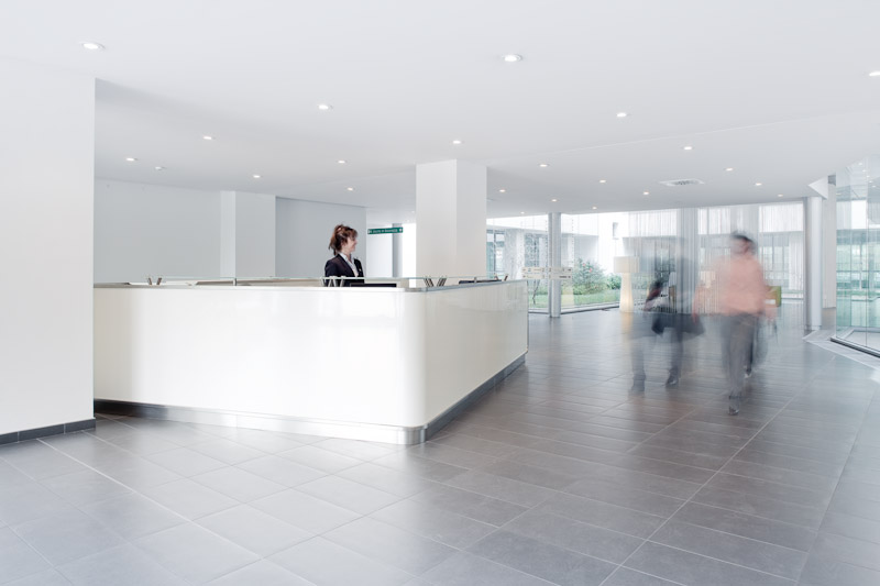 The reception zone has large glazed areas overlooking a garden, and modern, comfortable furniture.